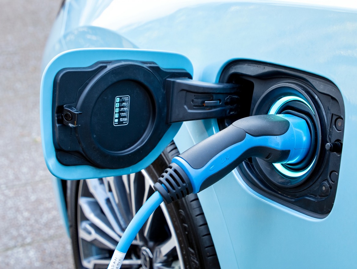Charging an electric car charging the batteries in the garage at home, not gasoline